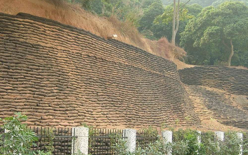 ①生態(tài)袋裝土?xí)r,考慮到后期坡體的綠化,選擇適合植物生長(zhǎng)的土壤,并加入保水劑、肥料、中砂等摻合料。保證每袋裝土不宜超量(50kg/袋),每袋裝土均勻。避免袋體產(chǎn)生較大變形及夯實(shí)時(shí)產(chǎn)生漲破。