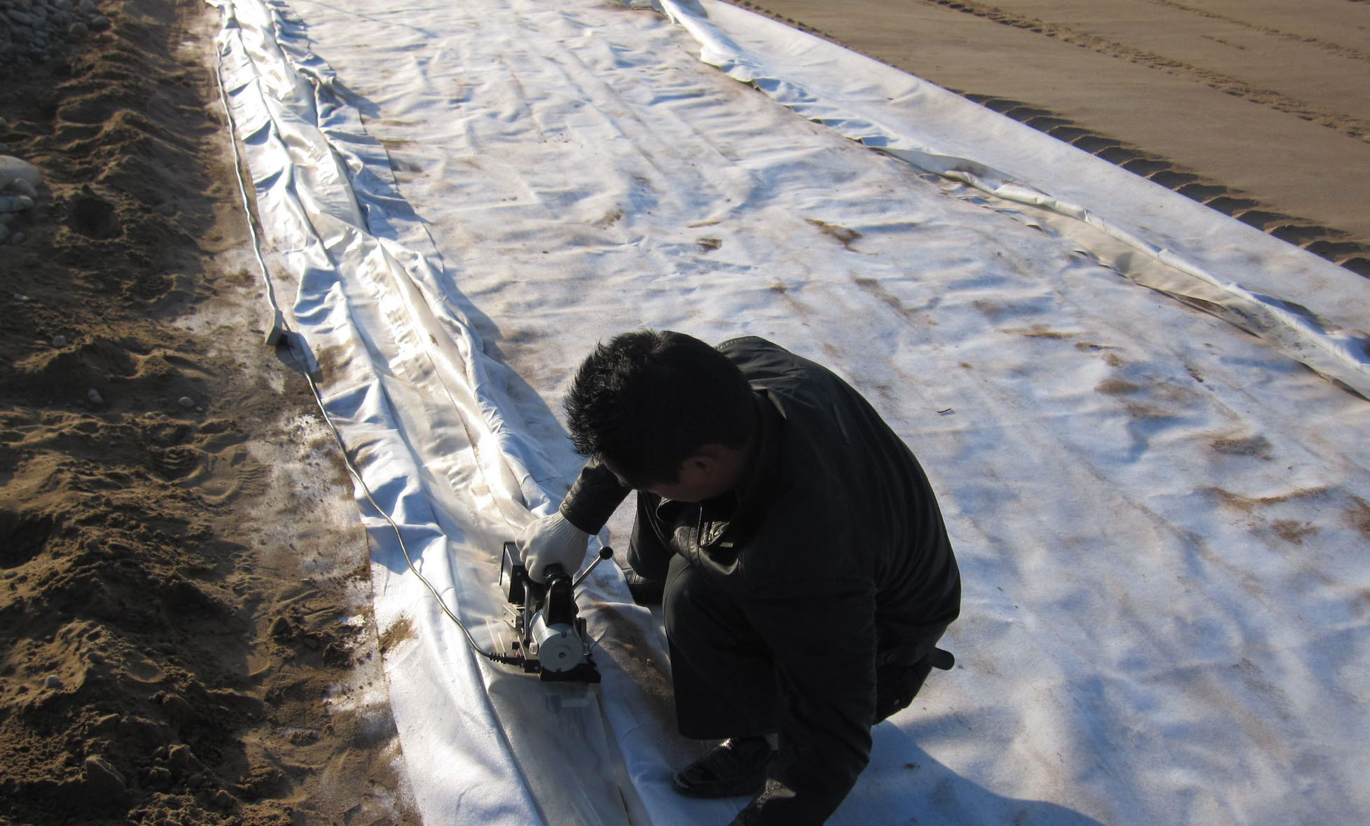 在土工膜鋪設前,基面上的雜物應清除干凈,基面尺寸、平整度、壓實度及墊層鋪設、排滲設施、土工膜固定溝等均應經監理工程師檢查簽證,未經檢查簽證不得進行土工膜鋪設。