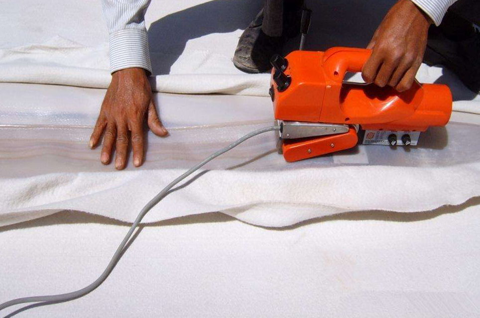 在垃圾場邊坡鋪設土工膜時,先把土工膜從事先確定好的位置平行于坡度線鋪設,順次鋪設的土工膜,相鄰兩片土工膜搭接 100-120mm(根據所用焊接機不同,搭接寬度也會有差異,如:瑞士產的LEISTER6C型熱楔焊接機(小)搭接寬度為100mm,瑞士產的LEISTER ASTRO 熱楔焊接機(大)搭接寬度為120mm,美國產的WEDGEIT 2000型熱楔焊接機搭接為120mm,德國產的GEOWELD PLUS熱楔焊接機搭接為120mm。)
